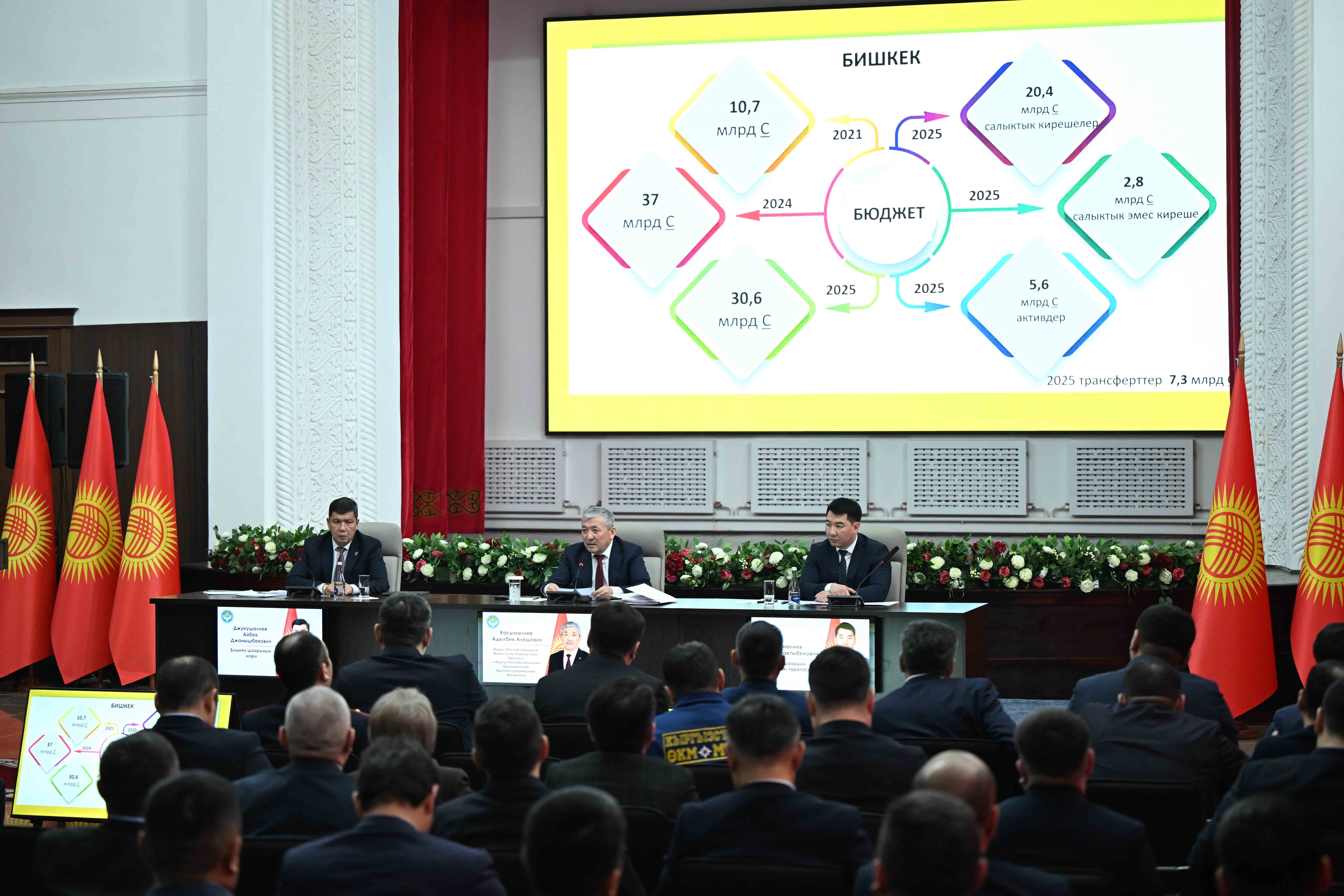 Адылбек Касымалиев Бишкек шаарынын бюджети 2021-жылы 10,7 миллиард сомду түзсө, төрт жылдын ичинде 20 миллиард сомдон ашык көбөйгөнүн кошумчалады. 2024-жылы иш жүзүндөгү киреше 37 миллиард сомду, ал эми 2025-жылы иш жүзүндөгү киреше 30,6 миллиард сомду түзгөн. 1970-жылдан 1990-жылга чейин шаар архитектуралык жактан олуттуу өзгөрүүлөргө дуушар болгон, бүгүнкү күндө курулуш ошол эле темпте жүрүп жатат.