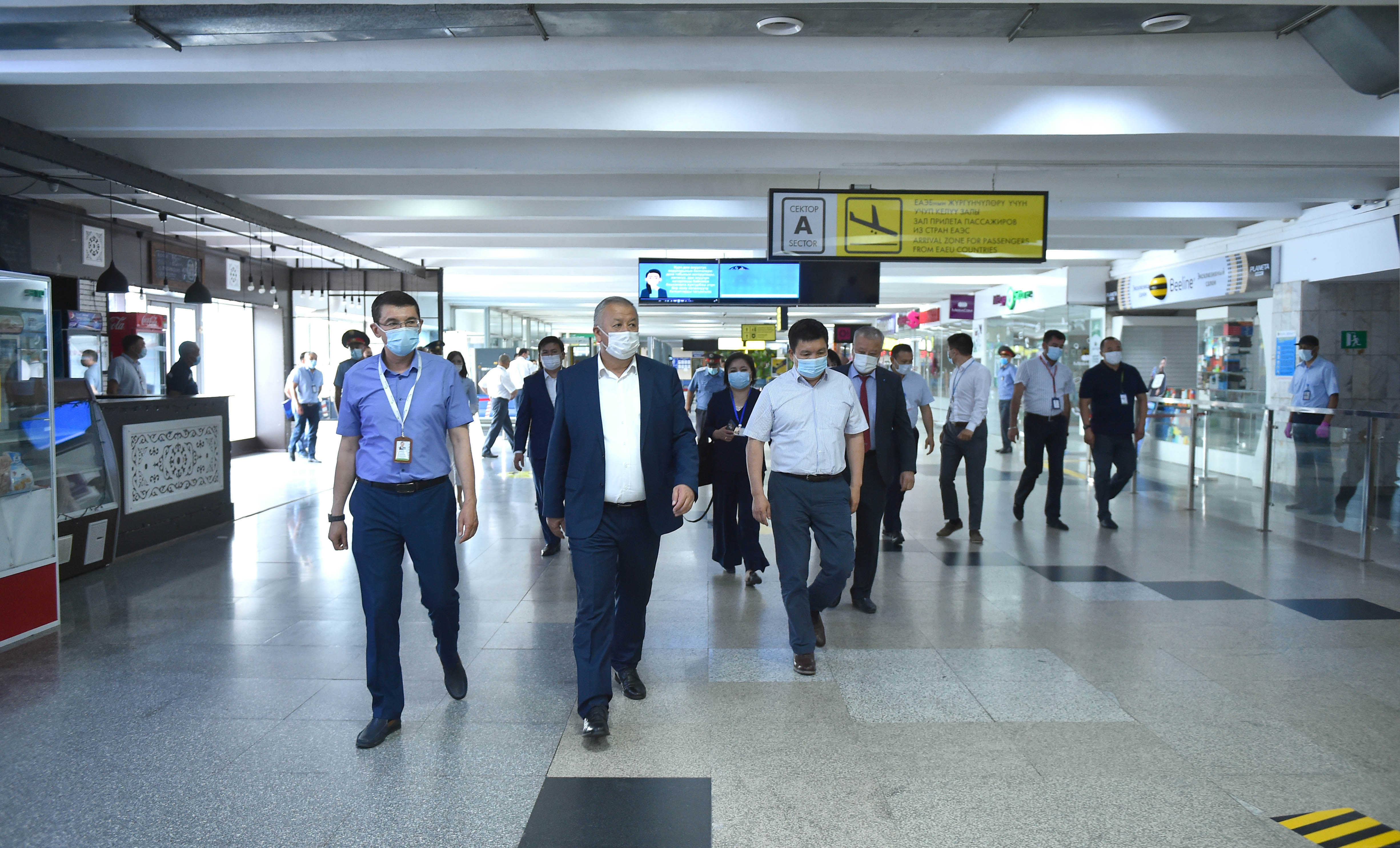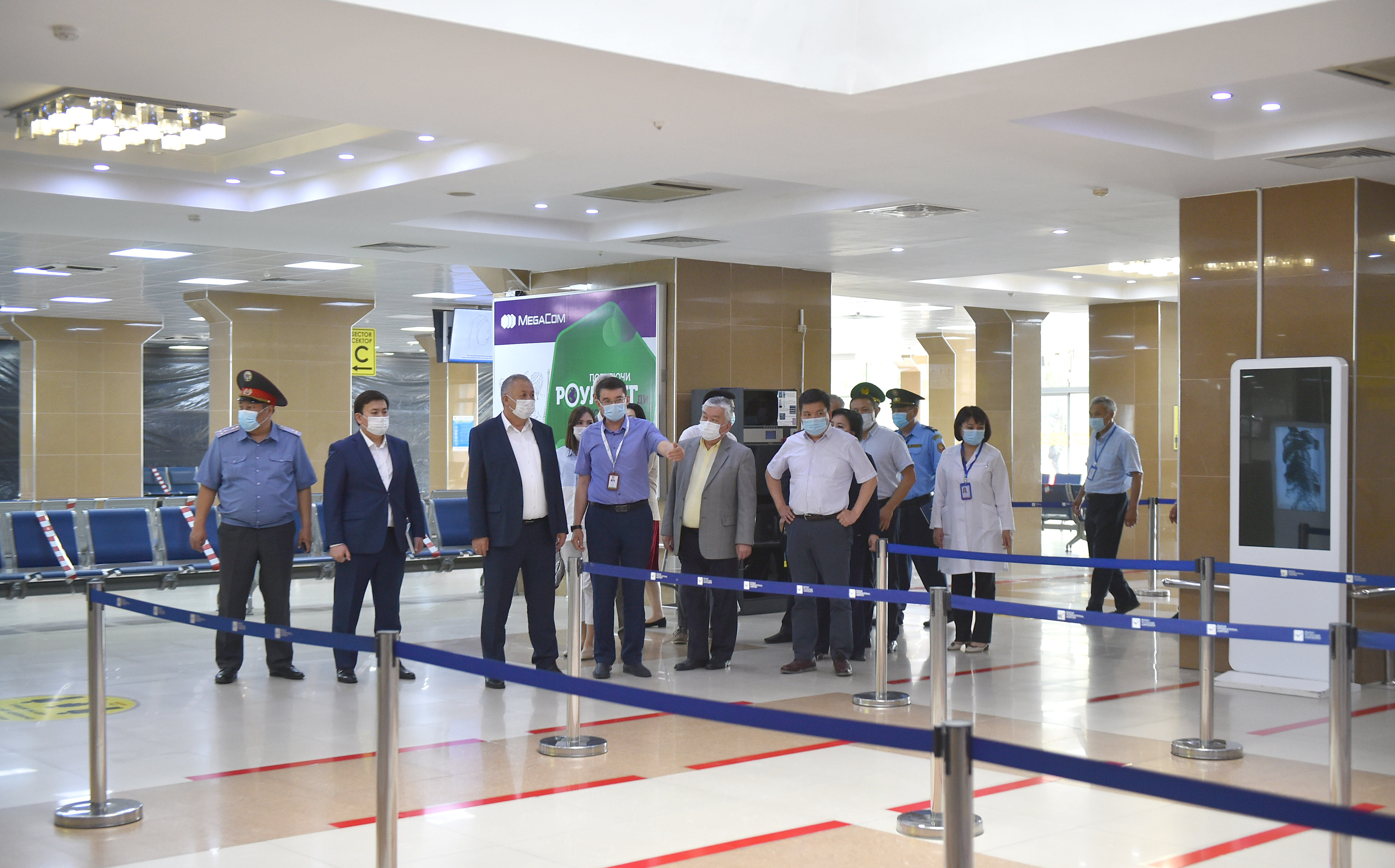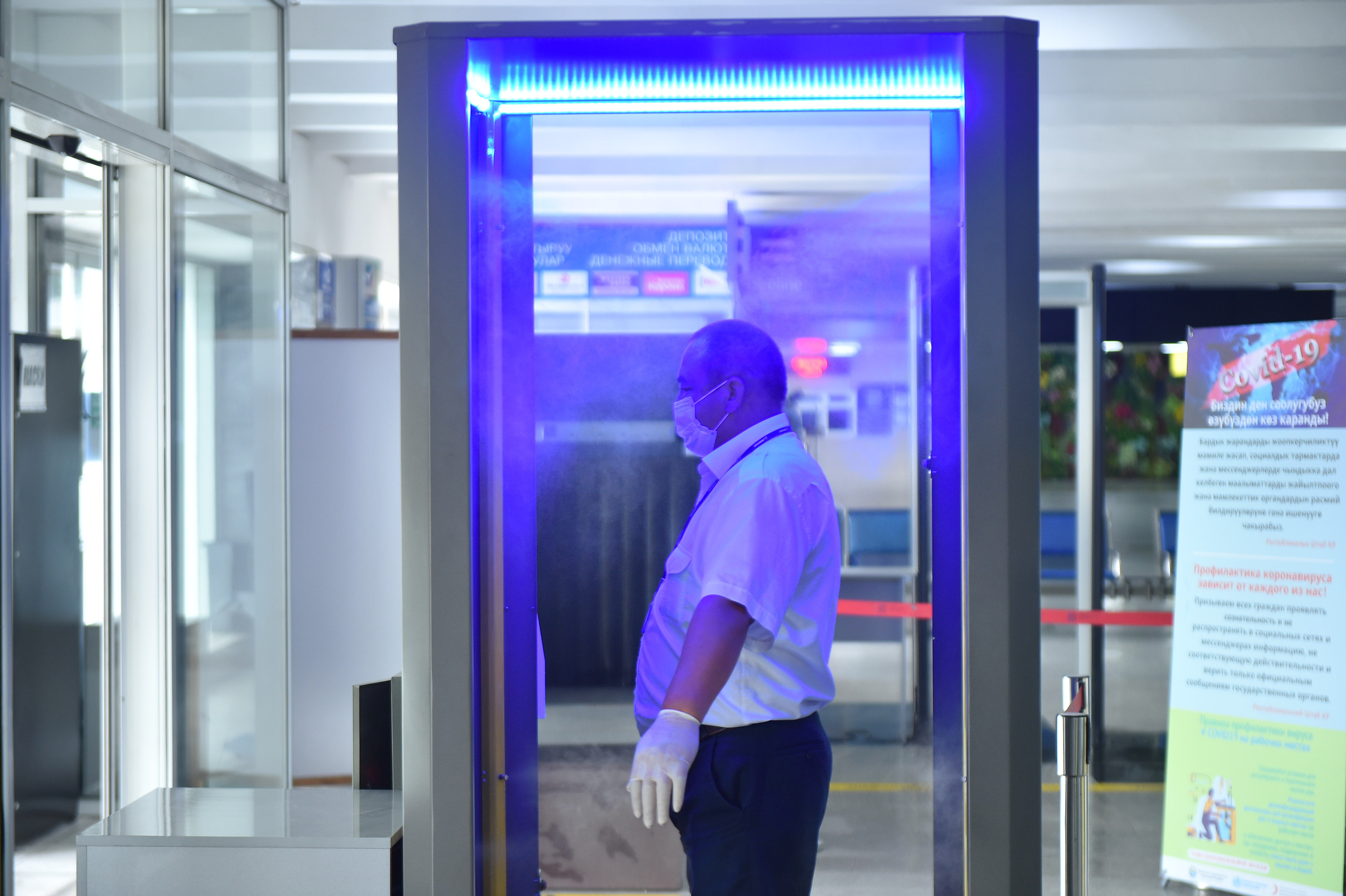 Аэробекеттер имаратынын кире беришинде бардык жүргүнчүлөр жана жүк милдеттүү түрдө дезинфекциялоочу туннелден, термометрдик көзөмөлдөн жана дене табын тепловизордук камералар менен ченөөдөн өткөрүлөт.