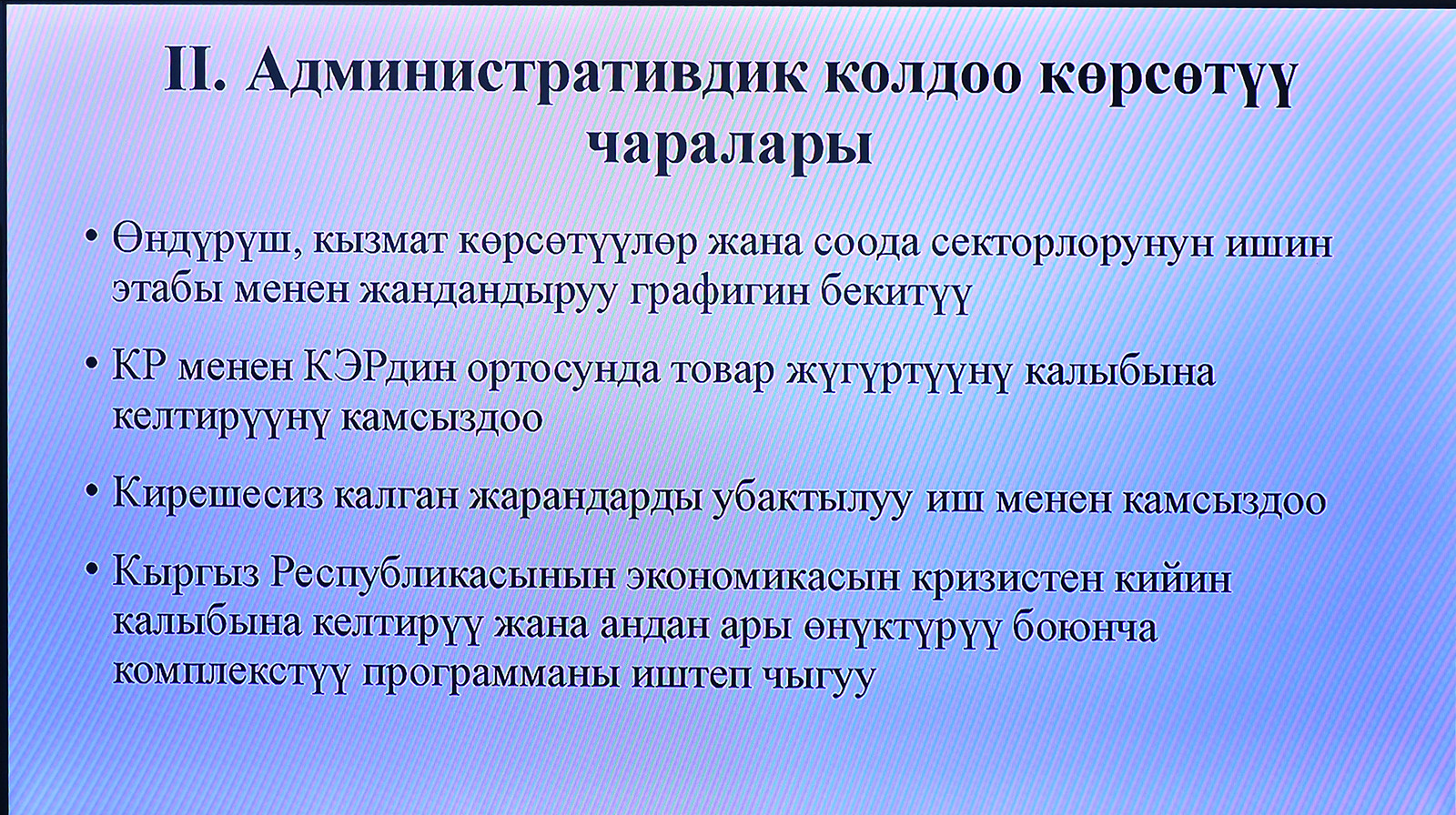 «Айыл чарба, тамак аш өнөр жайы мелиорация министрлигинин маалыматына караганда, майдын аягында бардык талаачылык иштер аяктайт, ал эми айрым аймактарда түшүм жыйнала баштайт. Эң негизгиси биз ирригация маселесин чече алдык. Пандемияга карабастан, дыйкандар үрөн, жер семирткич жана күйүүчү-майлоочу май менен жетиштүү көлөмдө камсыздалды. Кандайдыр бир тобокелчиликтер болду, бирок ошол эле учурда бардык санитардык нормаларды сактоо менен жазгы талаачылык иштерди жүргүзүү үчүн атайын техникаларды сатуу түйүндөрүн ачууга уруксат берилди», - деди Премьер-министр.