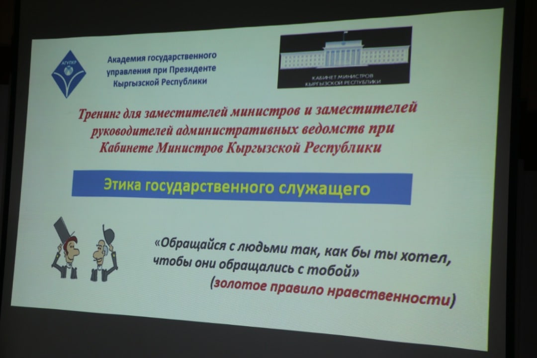 C 29 марта по 21 апреля 2022 года в академии государственного управления при Президенте Кыргызской Республики имени Жусупа Абдрахманова проходят тренинги по темам: «Подготовка, представление и защита законопроекта», «Деловой государственный язык», «Эффективное публичное выступление и навыки презентации», «Управление государственными закупками товаров, работ и услуг», «Этика государственного служащего».