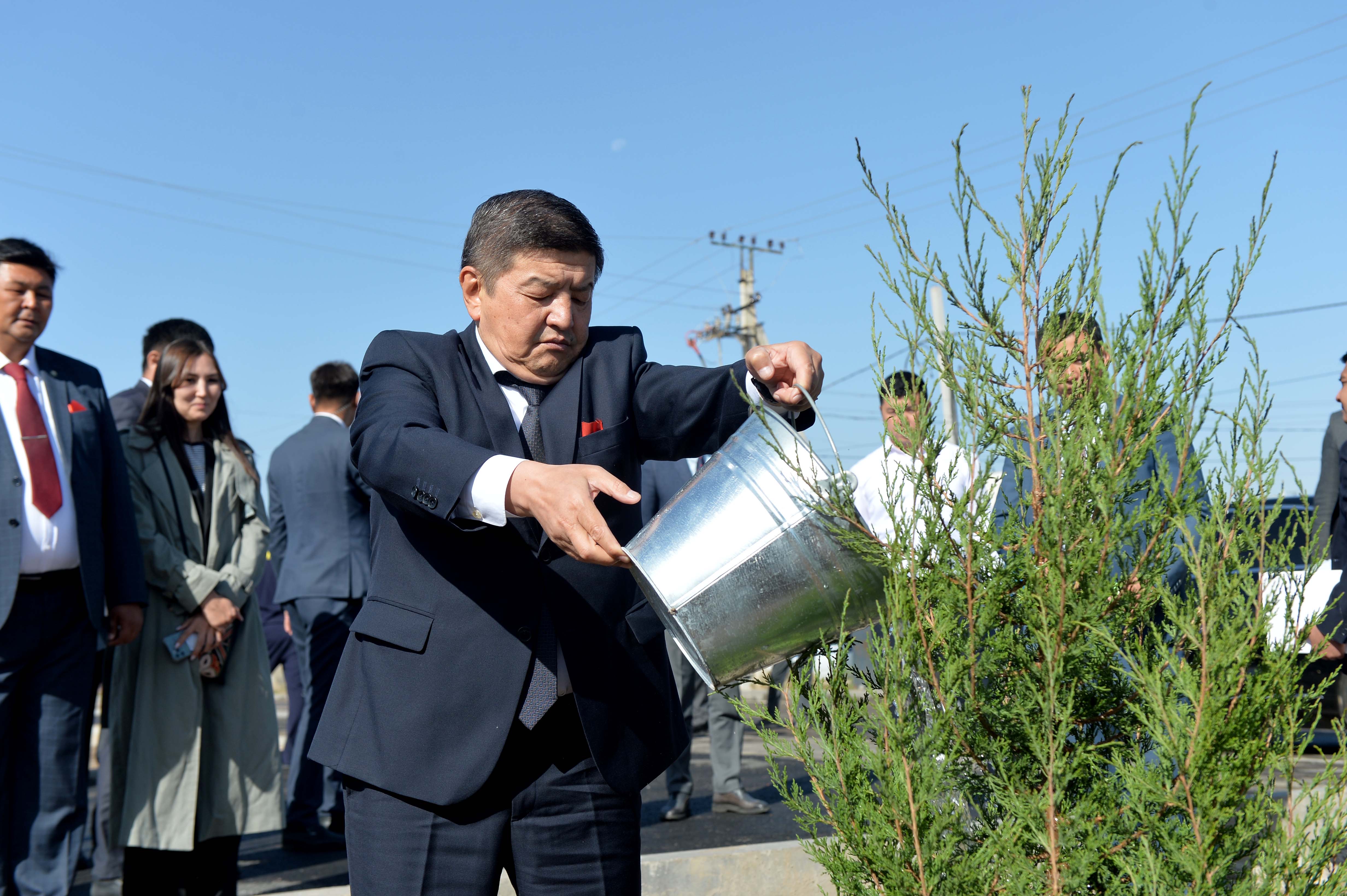 Далее Глава Кабинета Министров Акылбек Жапаров и мэр города Бишкек Эмилбек Абдыкадыров осмотрели школу, поговорили со школьниками и приняли участие в посадке зеленых насаждений на территории образовательного учреждения.