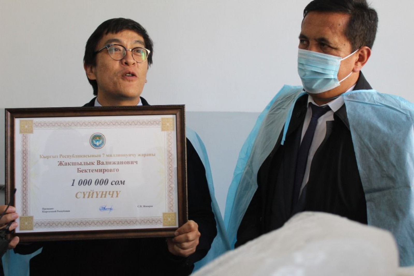 В торжественной обстановке в здании родильного отделения Кызыл-Кийского городского центра общей врачебной практики состоялась церемония вручения сертификата от имени Президента Кыргызской Республики на сумму 1 млн сомов для открытия депозитного счета 7-миллионному гражданину, который по достижению 16-летнего возраста получит порядка 11,5 млн сом. Кроме того родители мальчика получат сертификат номиналом 200 тысяч сомов.
