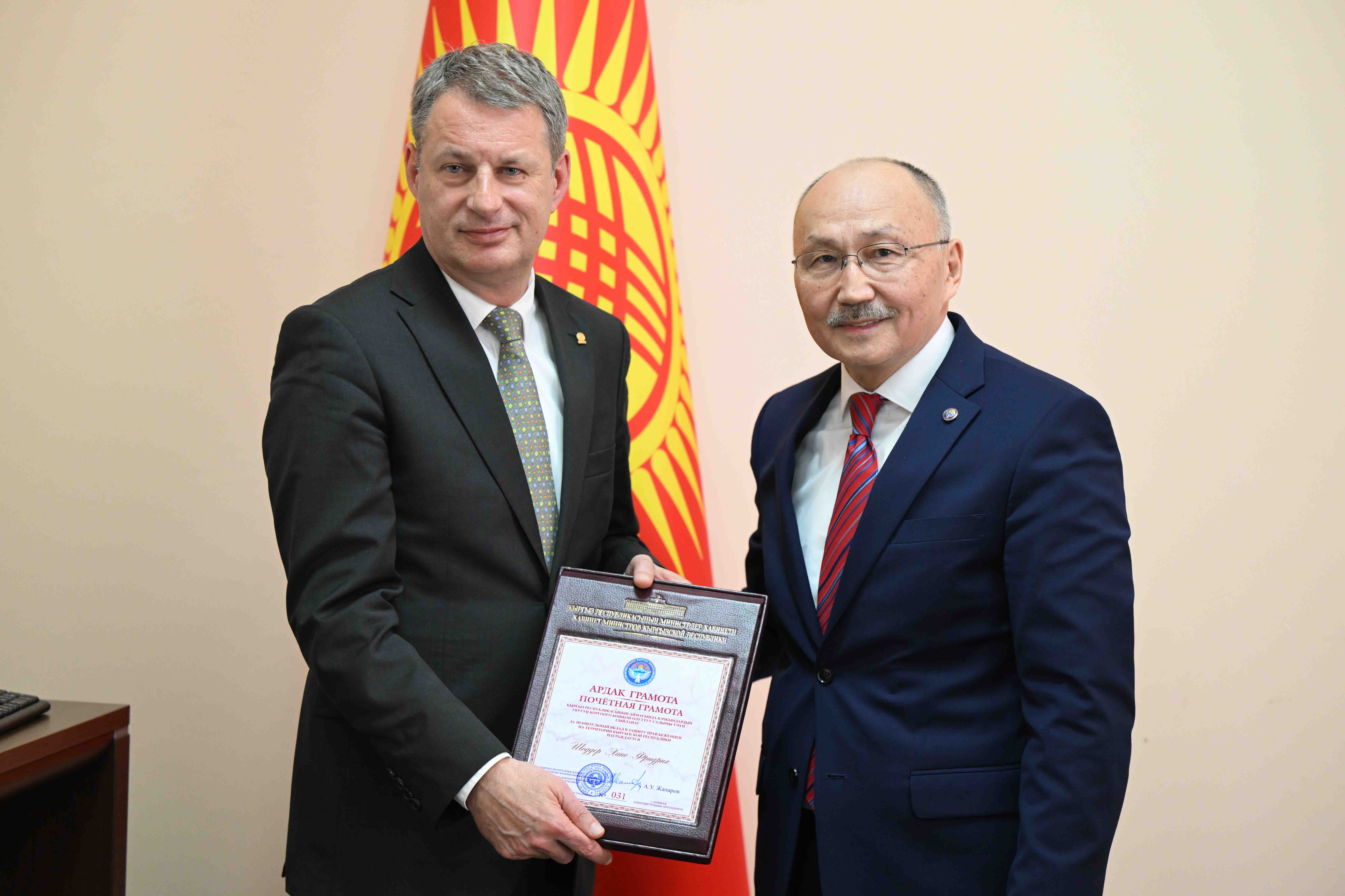 Региональный представитель Управления Верховного Комиссара по делам беженцев ООН в Центральной Азии Ханс Фридрих Шоддер награжден Почетной грамотой Кабинета Министров Кыргызской Республики