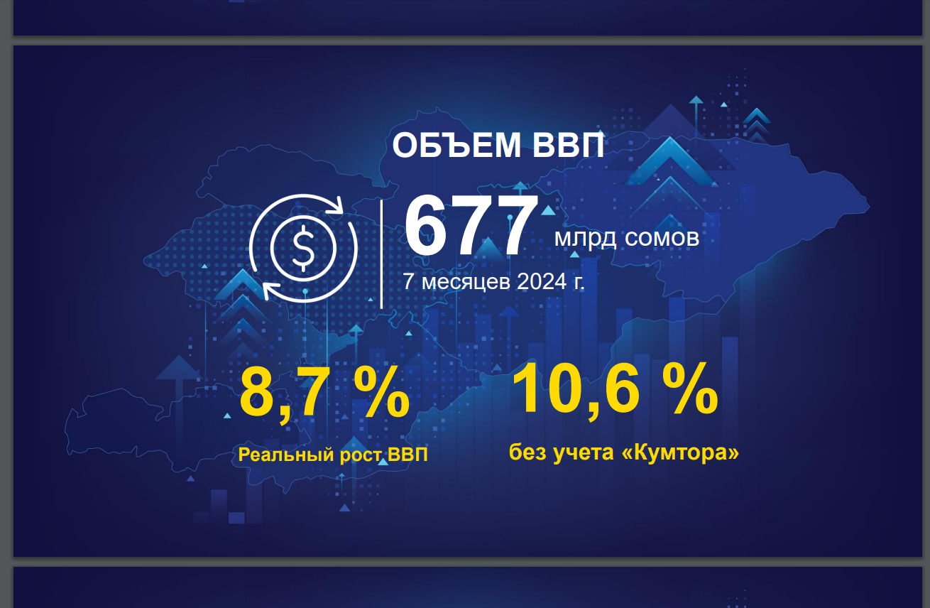 «Объем ВВП Кыргызстана по итогам января-июля 2024 года составил более 677 миллиардов сомов, а темп реального роста ВВП составил 8,7 %. Если не учитывать вклад Кумтора, то объем ВВП вырос в реальном выражении на 10,6 %, что подчеркивает значительный экономический рост в стране и ускорение темпа роста по сравнению с 2023 годом», - сказал Акылбек Жапаров, добавив, что «подобный рост, в условиях глобальной нестабильности и вызовов говорит о том, что экономика не просто адаптировалась – она вышла на новый уровень и продемонстрировала настоящий прорыв».